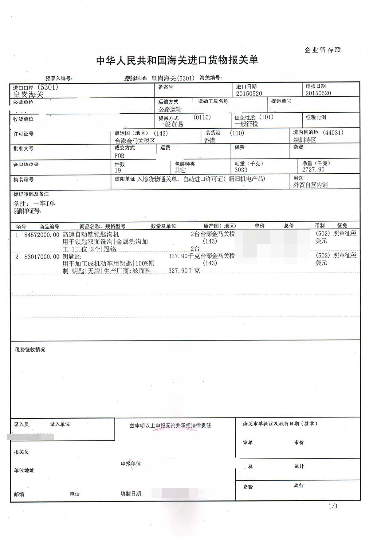鎖匙銑溝機,由迭料倉或震動盤(選購)自動入料、鎖匙胚雙面銑溝、出料,一貫作業流程,入料站:經迭料倉送入鎖匙胚,每具料倉約可置入150~180枚鎖匙胚(依鎖匙胚厚度而定)。震動盤入料(選購):單一種類鎖匙可選購震動盤統一鎖匙方向入料,并有隔音罩減少噪音產生。銑溝站:先后進行鎖匙胚正反面銑溝。集料站:自動將成品收集置于集料盒。潤滑設備:采用銑刀專用潤滑劑與切削液自動循環系統我司擁有豐富的高速自動銑鎖匙溝機進口報關手續流程及案例,現在為大家詳細介紹一下關于高速自動銑鎖匙溝機進口報關那些事兒!