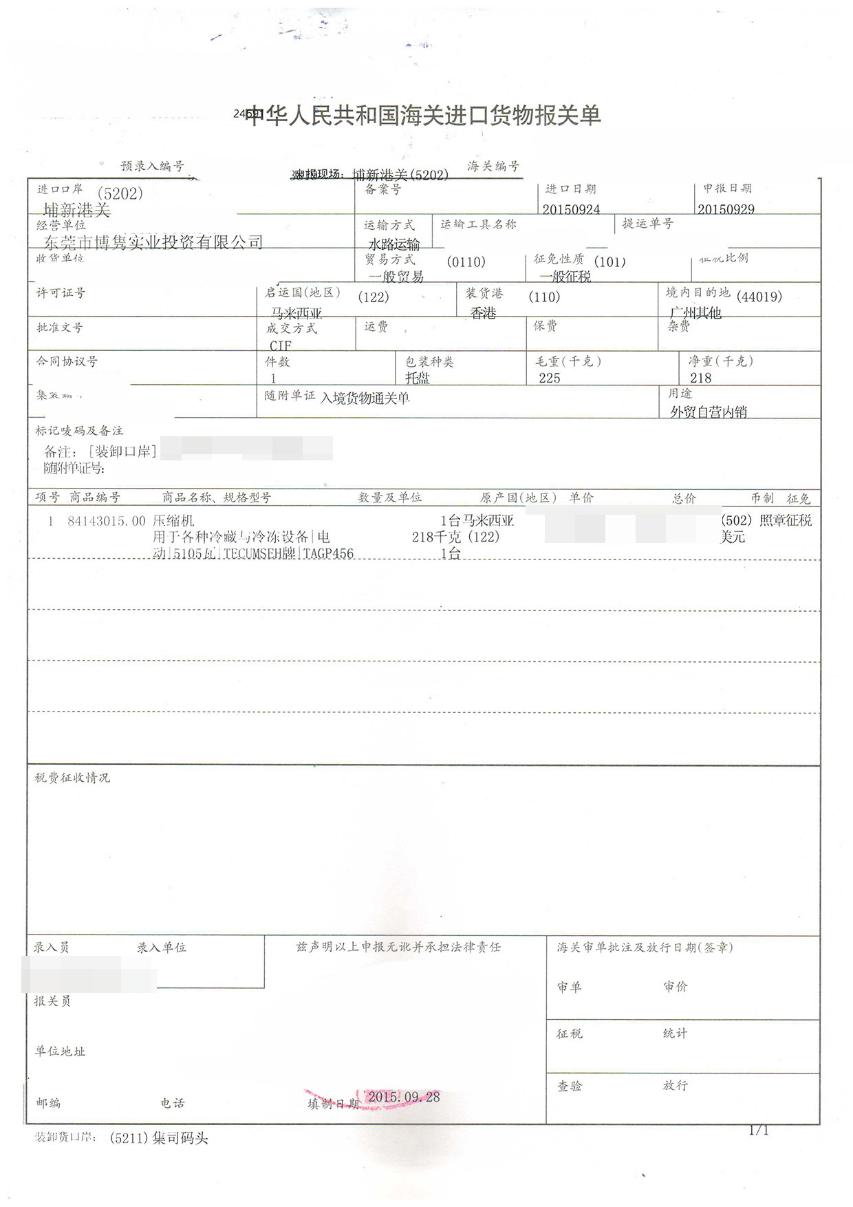 三、壓縮機(jī)進(jìn)口報關(guān)案例展示