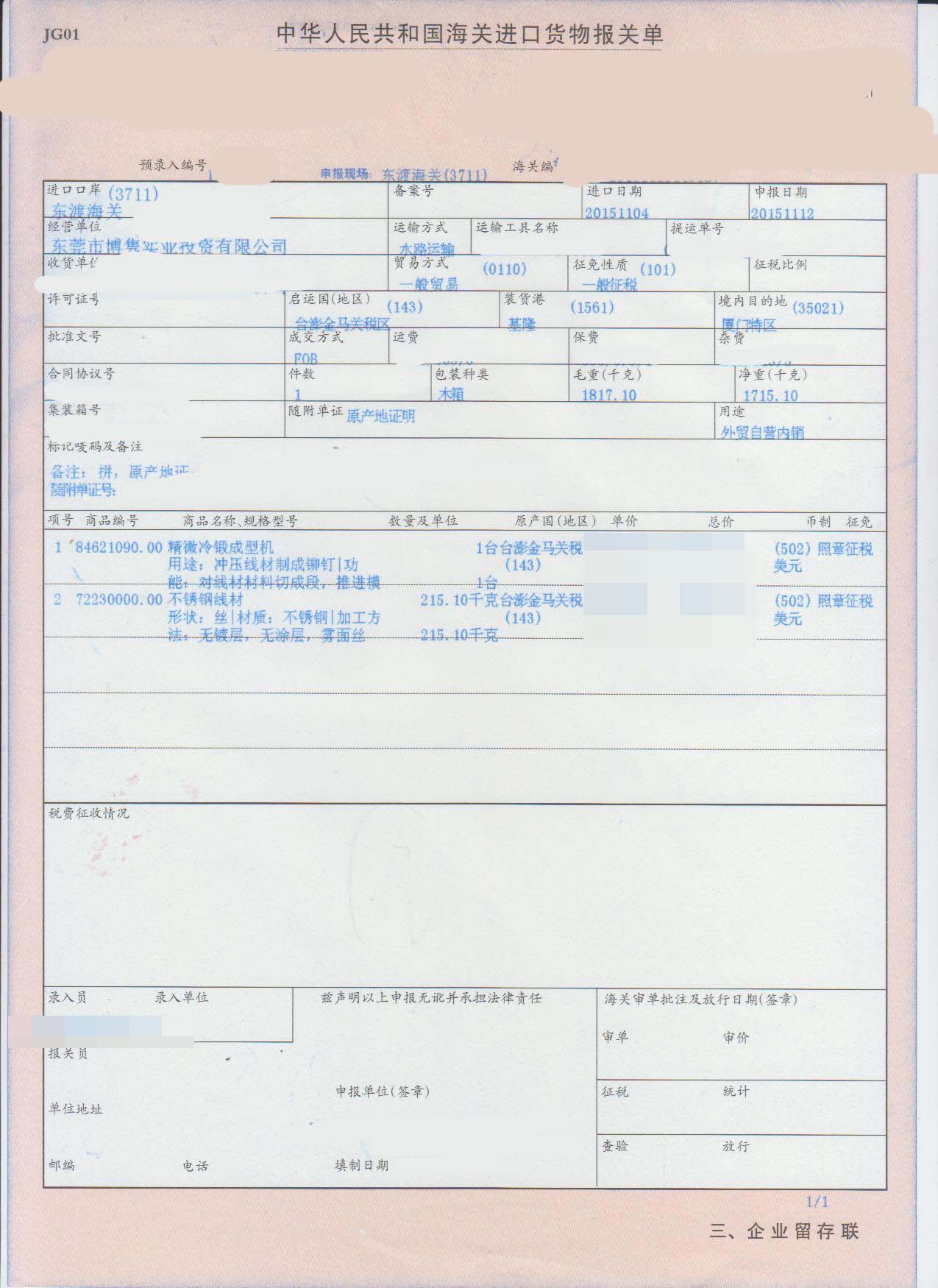 二、精微冷鍛成型機進口報關流程: