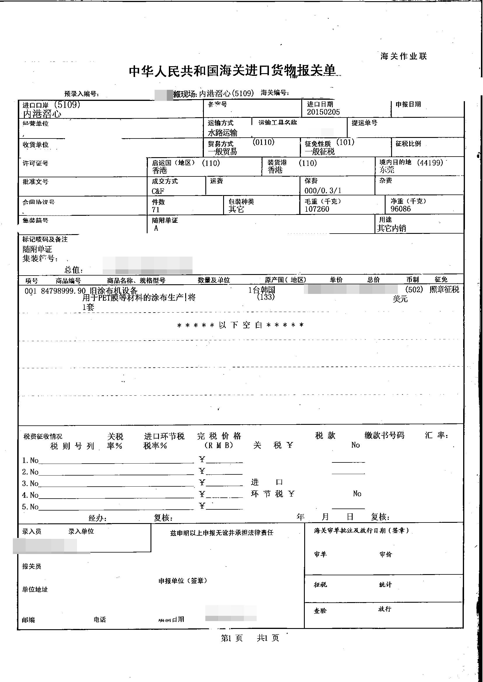 一、舊涂布機(jī)設(shè)備進(jìn)口報(bào)關(guān)手續(xù)資料